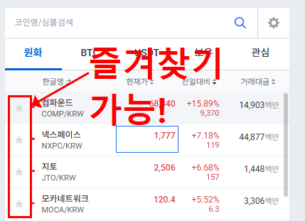 코인 이름과 현재 가격, 상승/하락률이 리스트로 나옵니다. 관심 있는 코인은 ‘★즐겨찾기’ 해두면 맨 위에 고정됩니다.